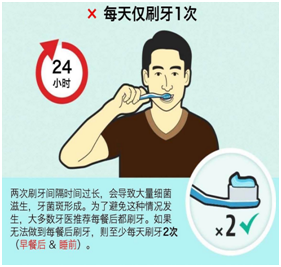 為了(le)保證(zheng)每(mei)個(ge)牙(ya)面(mian)都有(you)足夠的拂刷時間(jian),每(mei)次刷牙(ya)時間(jian)不少于三分鐘。為了(le)控制牙(ya)菌斑,保持口(kou)腔衛(wei)生與口(kou)氣(qi)清新(xin),至少每(mei)天早晚刷牙(ya)一次。